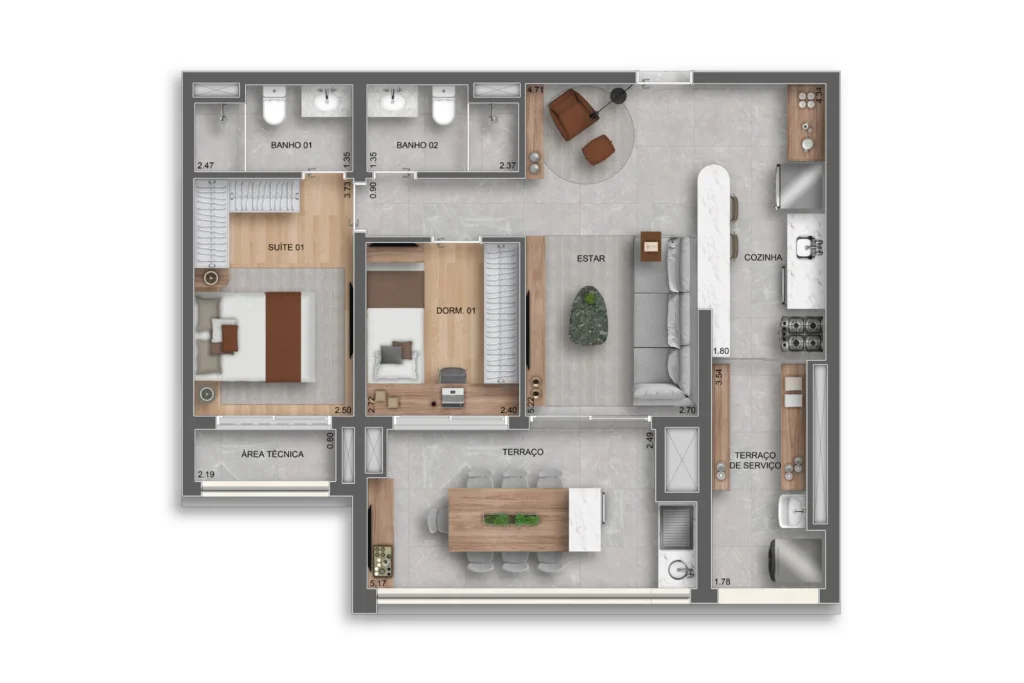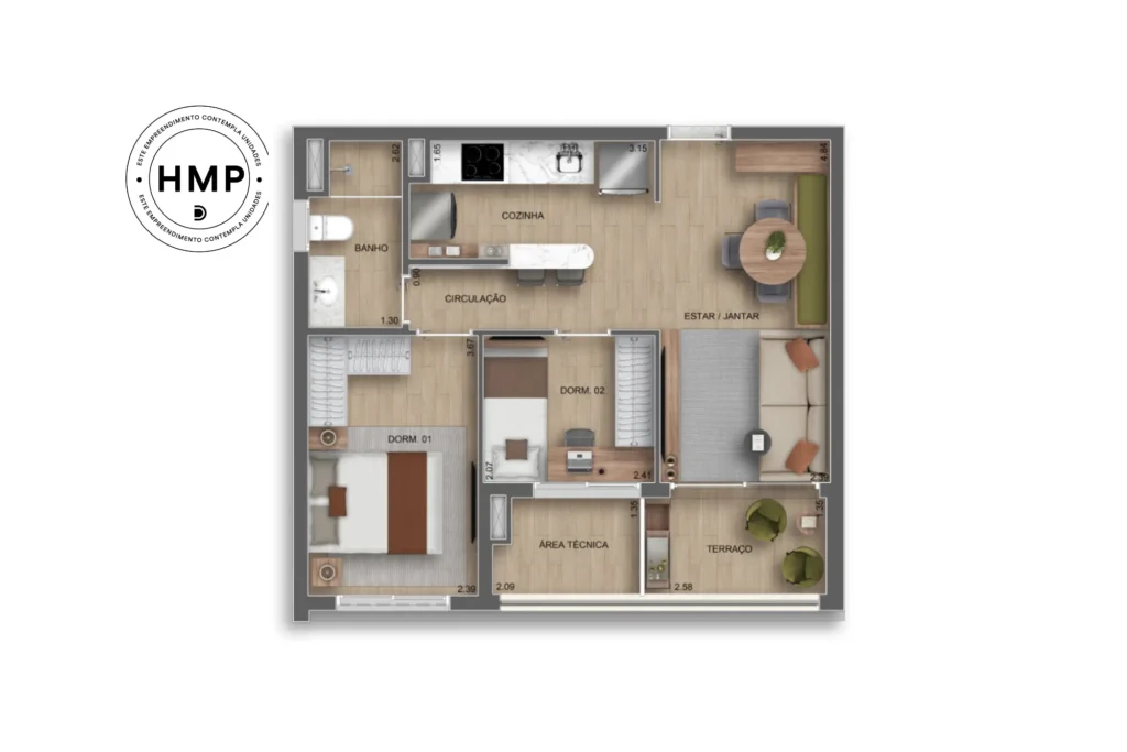 Apartamento 80m² · 2 dorms (1 Suíte)